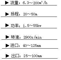 | 流量 (m3/h) | 揚程 (m) | 電機功率(kw) | 汽蝕余量(m) | 效率 | 流量 (m3/h) | 揚程 (m) | 電機功率(kw) | 汽蝕余量(m) | 效率 (%) | |