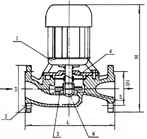 其連接過(guò)程為:電機①的加長(cháng)軸上連裝機械密封④、葉輪③、并用墊圈⑤和螺母⑥緊固;泵體②和電機蓋之間加一